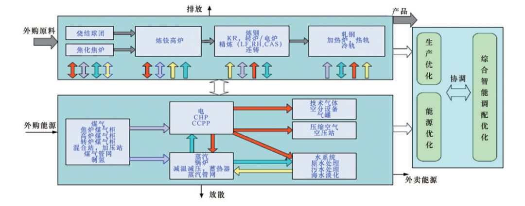 钢铁工业智能制造的目的,是围绕钢铁流程“钢铁产品制造、能源高效转换、废弃物消纳处理与再资源化”3个功能,提升“他组织力”,进行结构优化与程序优化,实现全流程动态有序、协同连续运行和多目标整体优化(图1)。