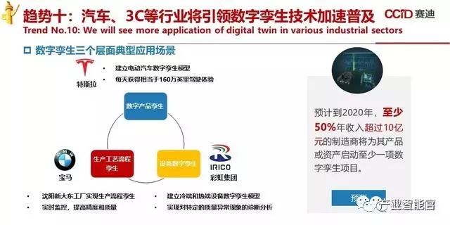 数字孪生技术作为企业数字化升级和智能工厂建设的第一选择,将从数字产品孪生、生产制造流程数字孪生和设备数字孪生三个层面,优先在工艺成熟度较高的汽车制造、电子制造领域铺开。预计到2020年,至少50%年收入超过10亿元的制造商将为其产品或资产启动至少一项数字孪生项目。