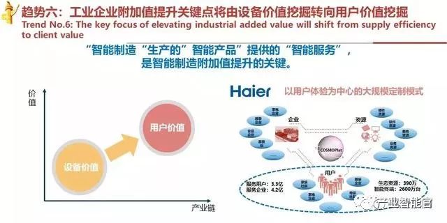工业发展进程正在从企业产品牵引用户需求转变为用户需求引领企业生产,智能制造对于工业领域附加值的提升也应该逐步从生产制造环节的降本增效,转向提供高附加值衍生服务,即“智能制造“生产的”智能产品”提供的“智能服务”,将成为工业企业附加值提升的关键。