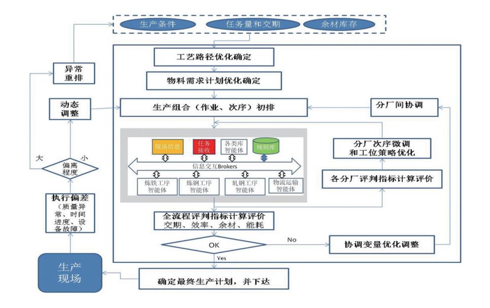 2)不确定性。在实际生产中存在很多随机的和不确定的因素,如外部订单的增减、交货期的改变、环保要求的产量限制,内部各工序加工时间的波动、设备状态的变化、质量偏差、物流瓶颈等,都会干扰全流程各工序顺行,需要动态调整。