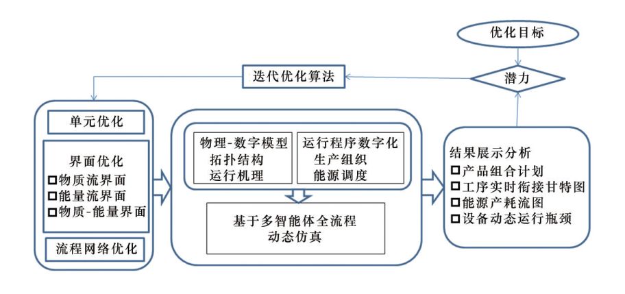 流程模型化是流程优化的前提。首先基于流程机理建立物理系统模型,对流程进行结构化(形成合理的流程网络)、概念化(对多因子物质流运行性质的描述)理解基础上,进行的整体物理描述(包括“程序”描述)。进而,基于物理模型建立数字化模型,包括工序数学模型、平面布置图 GIS(地理信息系统)、工序关联语义网络和运行“程序”数字化。