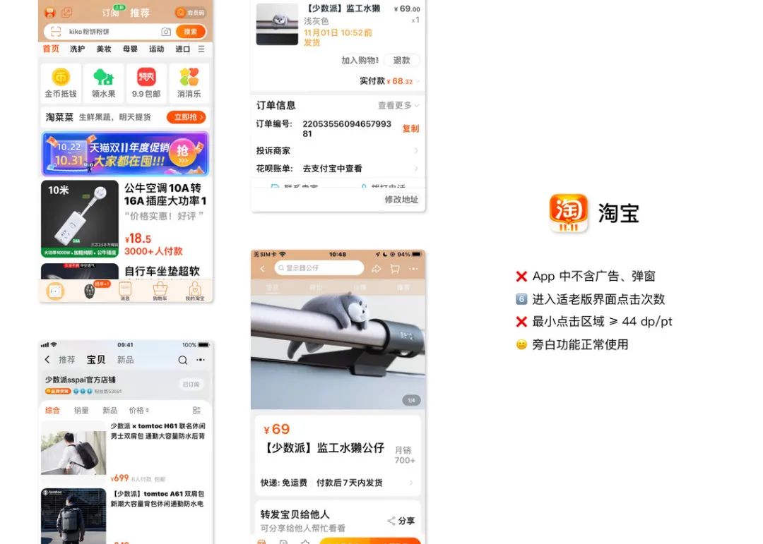 目前淘宝的长辈模式基本实现浏览、购买商品过程的覆盖 —— 首页、搜索、商品相关页面、订单相关页面,首页中除了简化页面元素,还增添了「淘小宝」语音搜索功能,用户可通过普通话说出想要搜索的物品,但由于淘宝 app 中含有数量庞大的页面,改造起来也要不少功夫。