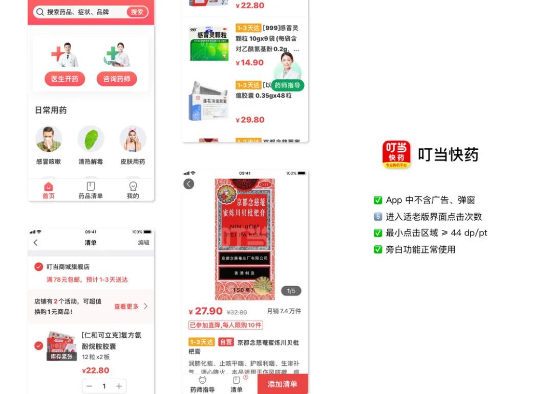 叮当快药 app 的关怀版采用大字体、大图标、高对比的设计,视觉上比较容易辨认。整个界面没有广告或营销信息,避免老年人被广告误导。