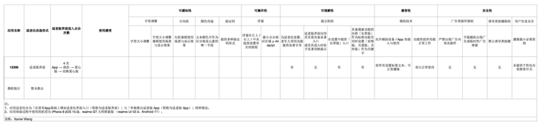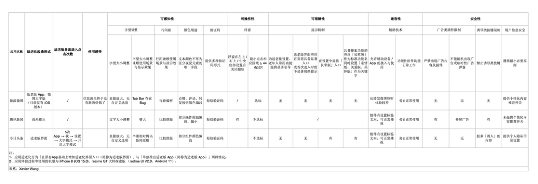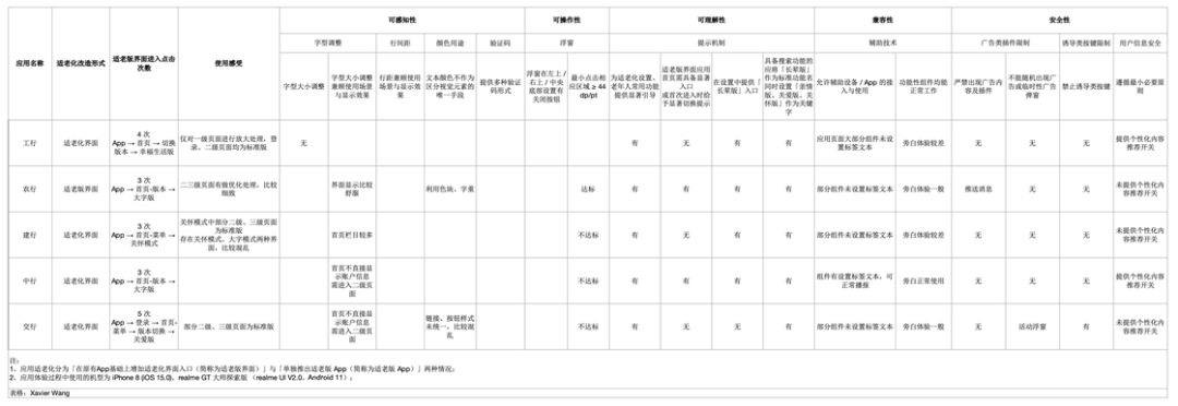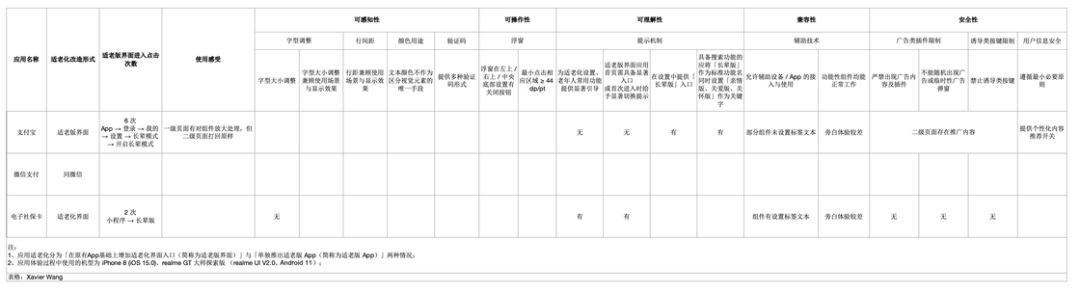 本次体验的标准参考工信部 《移动互联网应用(APP)适老化通用设计规范》 ,同时加上个人的主观感受。体验涉及新闻资讯类、社交通讯类、运营商类、购物类、美食外卖类、娱乐类、工具类、支付类、银行类、地图类、网约车类、票务类、医疗类、医药类 14 个大类,共 42 个 app,其中有 5 个暂未推出适老化版本(截止至 10 月 29 日)。