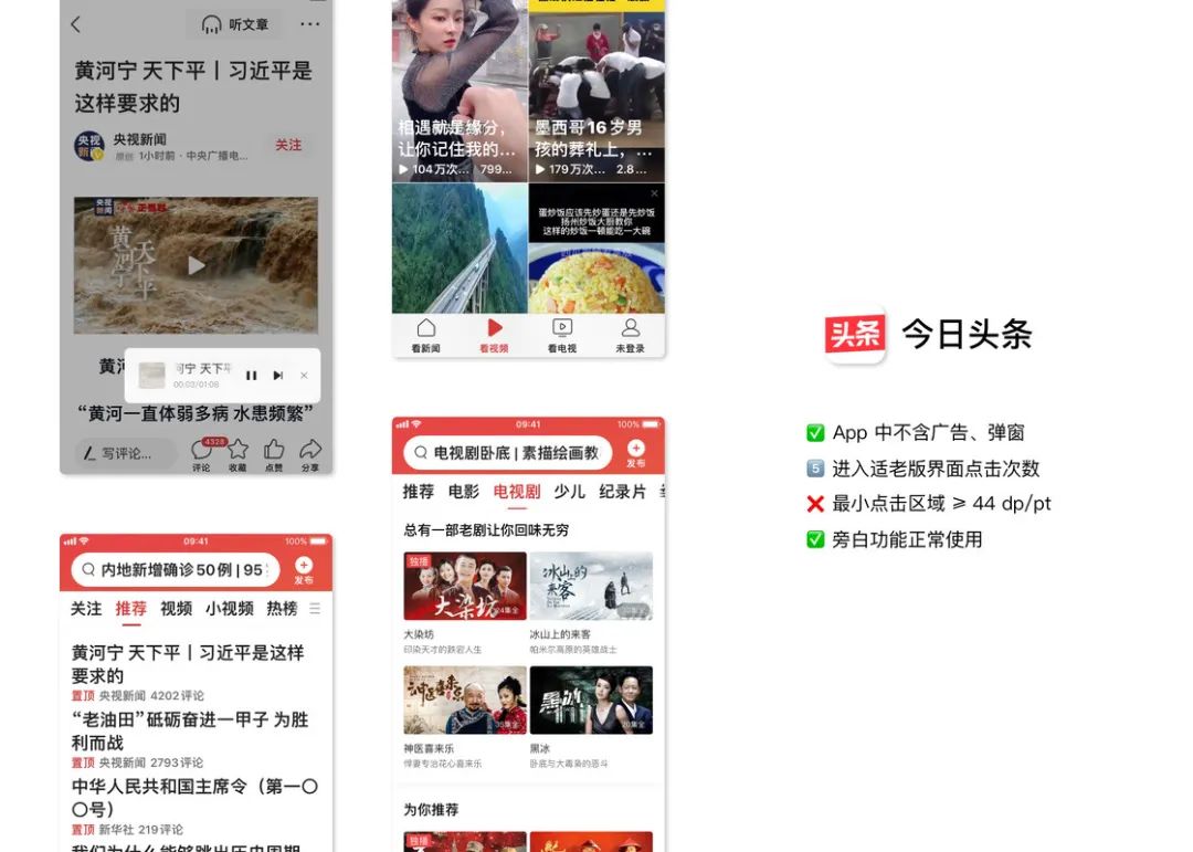 作为字节系的两个流量大头 —— 今日头条、抖音,都分别在其 app 中推出适老化界面,使得老年人能够更好地使用。