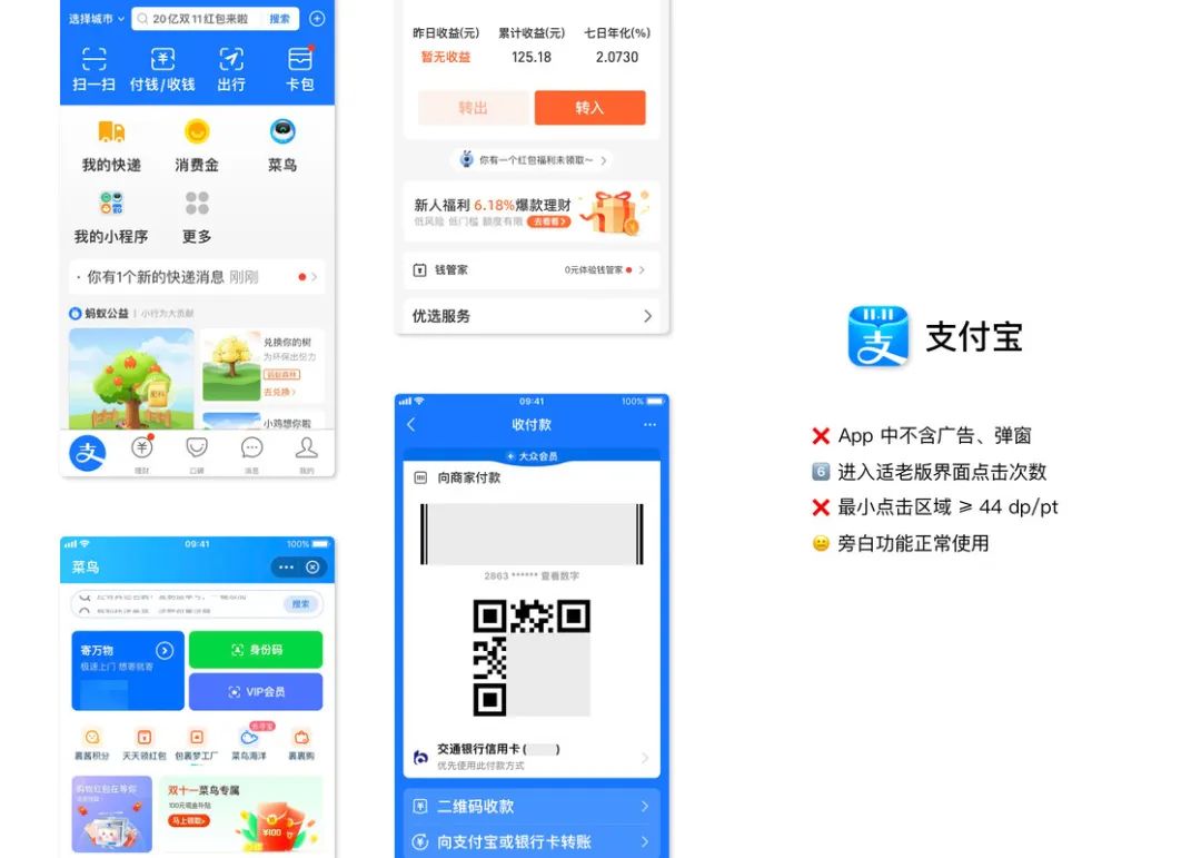 在理财、口碑页面,只是放大了文字与组件的大小,页面上展示的信息数量仍然较多,不利于老年用户阅读与理解。除此之外,支付宝的大部分功能由 H5 页面转为小程序,会出现与微信小程序相同的问题,适老化改造只能由开发者在开发过程中做出对应的调整,无法跟随 app 进行自适应调整。