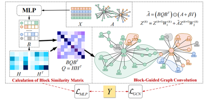 本文模型主要由两部分构成,分别为块相似度矩阵的计算模块和块相似度矩阵引导下的图卷积模块(如下图所示)。