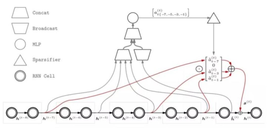 在前馈传播过程中,管理一个内存单元,并在每个时间步中最多选择过去记忆中的一个稀疏子集。这个过程称之为稀疏检索。