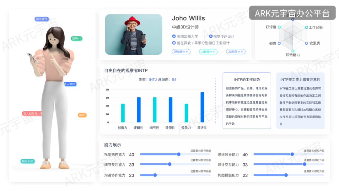 就像FIFA游戏里,数值策划师用射门力量、控球、远射、反应等单项能力的“数值”,来综合体现某位中锋的能力和价值,ARK的个人工作能力卡致力于打造一套可信、可落地、可用性强的工作能力拆分系统,将员工在线下不同工作执行中体现出来的能力,用数值的形式可视化呈现,并加入履历、过往项目经验及评价、技能、性格偏好、行为动机、思考方式、人格等各种职场软硬素质,全方位360°地呈现这名成员的个人信息。