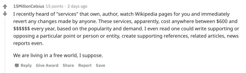 有一位留言者提到,他最近听说了一种针对维基百科词条优化的「收费服务」,费用大概是 600 美元或者更多,可能让你拥有、撰写维基百科的词条,同时及时修改其他任何人所做的编辑。你甚至可以利用这项服务撰写支持或反对某个人/观点/机构的文章,然后发布相关报道和文章作为参考来源。