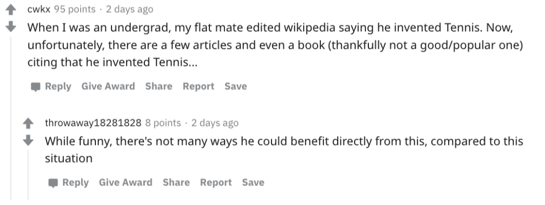 比如有一位留言者回忆起自己读大学的时候,他的室友成功编辑了维基百科词条,说自己是网球的发明者。在这之后,有一些文章和书籍在援引材料时,就真的将此人视为网球发明者……
