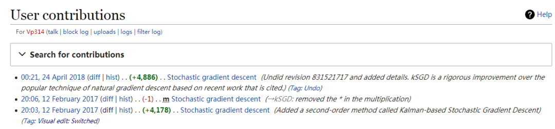 而且,这位用户对「SGD」词条的唯一贡献就是添加他的这项技术:第一次是将「Kalman-based Stochastic Gradient Descent」添加到「扩展和变体」;第二次是稍加改动;第三次是被删除之后重新添加,被删的理由是「最近几乎没有被学术界引用。」