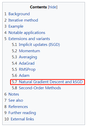 「SGD」词条的结构。上图为历史版本,新版本不包含图中的 5.7。历史版本链接:https://en.wikipedia.org/w/index.php?title=Stochastic_gradient_descent&oldid=945132087