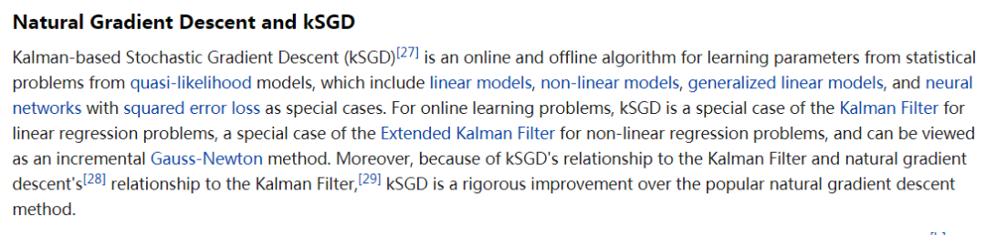 问题就出在这部分「扩展和变体」。要按说,能和 RMSProp、Adam 并列,这里列出的方法肯定都不差。但发帖者却发现,这部分包含了一篇比较冷门的论文(上图中的 5.7),文中提到了一种基于 Kalman 的随机梯度方法。