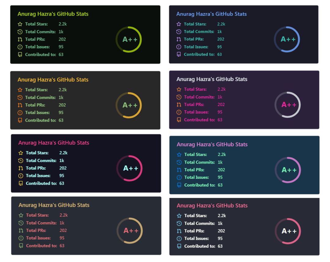 GitHub Readme Stats 是一个可在你的 README 中获取动态生成的 GitHub 统计信息的小工具。目前支持 dark、radical、merko、gruvbox、tokyonight、onedark、cobalt, synthwave、highcontrast、dracula 等多个主题。