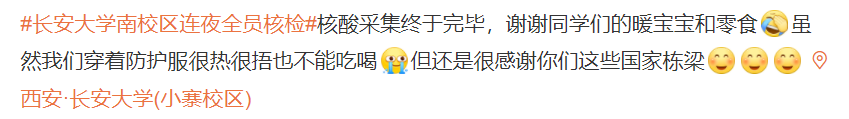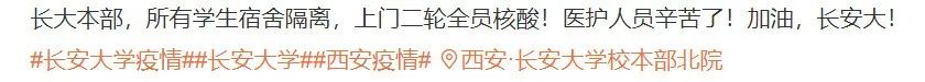 目前,长安大学第一轮全员核酸检测已经结束,并开展了第二轮核酸检测工作,所有学生宿舍隔离,由医护人员上门进行核酸采样。