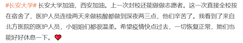 在本轮疫情面前,长安大学的学子表现出了优秀的素养。据海报新闻报道,一名长安大学渭水校区的学生透露,目前长大学生情绪都很平稳,“大家经历过之前的防疫,都很熟悉流程了,有什么事情辅导员也会及时通知。”