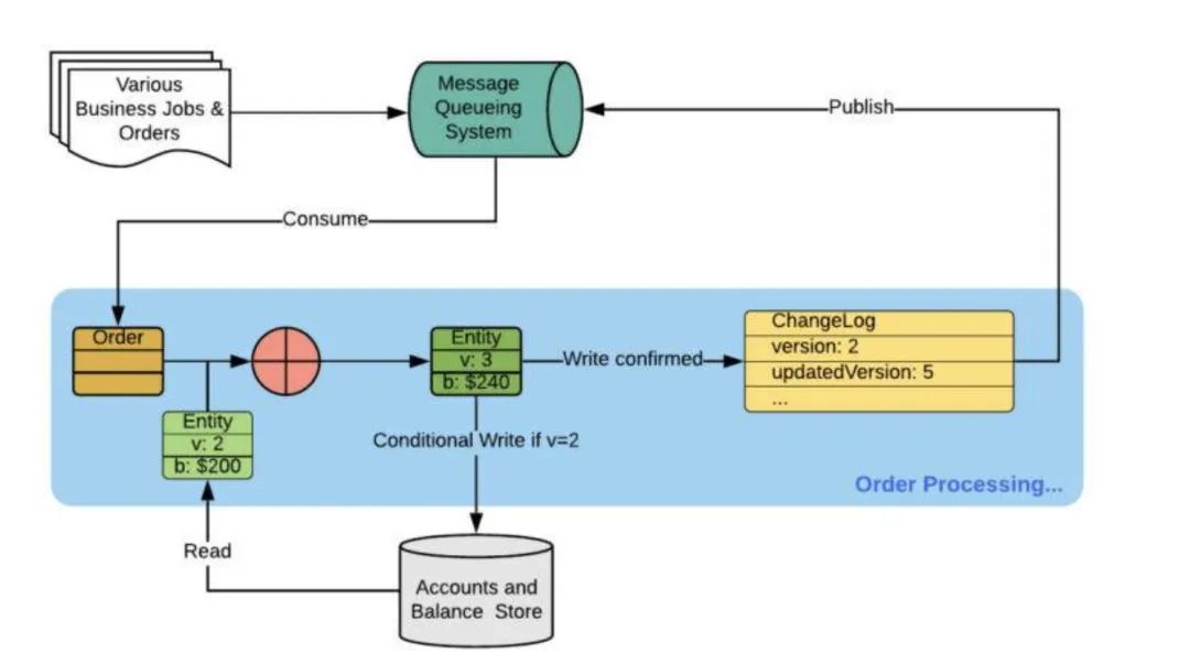 我们在处理每个订单时都会更新付款人和收款人账户。我们的服务生成一个 EntityChangeLog 来反映账户更改的顺序。每个 ChangeLog 条目都有一个版本号,我们为每个用户递增版本号。该服务使用版本号来强制写回订单的顺序。