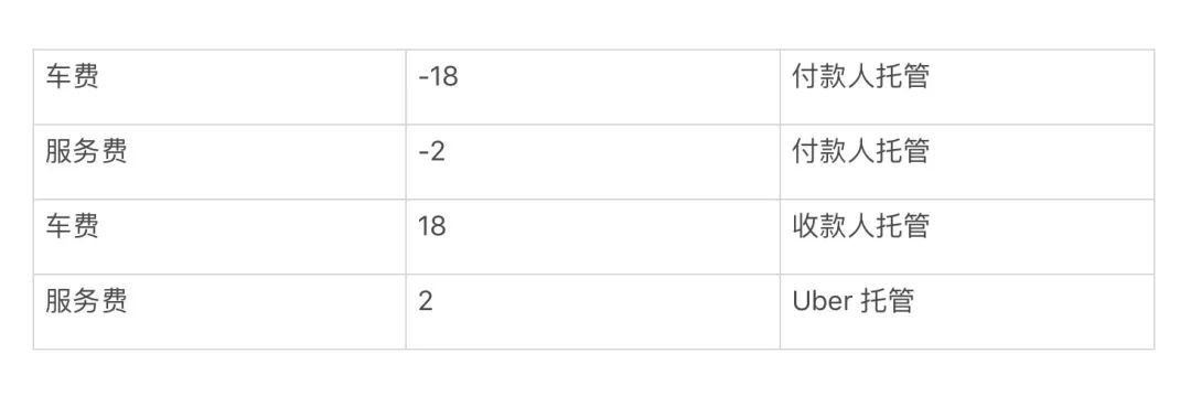 这个表格展示了一个简单的拼车旅行的示例,总票价为 20 美元,其中包括 2 美元的服务费和 18 美元的车费。所有订单条目的总和为零。
