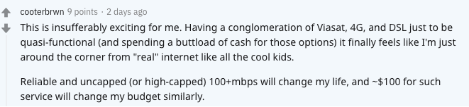 目前,Starlink加入了Hughes和VIASAT的行列(两家提供卫星上网的公司),成为无法获得电缆或光纤的农村用户的最后一站互联网服务提供商。