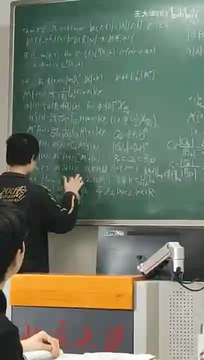 韦神面前的黑板上写满了密密麻麻的板书,他边讲边在黑板上继续写,另一只手不断挥舞,应该是在整理授课思路。
