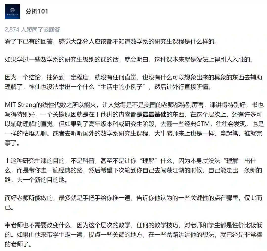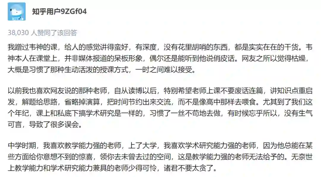不过,对「韦神讲课不行」这个话题,知乎不少网友表达了自己的不同看法。