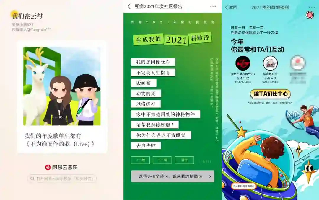豆瓣的“拼贴诗”,一共21组,可任意挑选3-6句,生成拼贴诗;微博的最常互动好友,点击“给他们比个心”,可以生成小卡片,发布微博;别人的默默关注,可以点击“给他们惊喜”,生成小卡片,发布微博;网易云音乐的“彩蛋”可生成图片分享;同时增加了和“好友合照”,增加互动;哔哩哔哩则玩起了“一句话总结我的 2020”的互动小游戏。