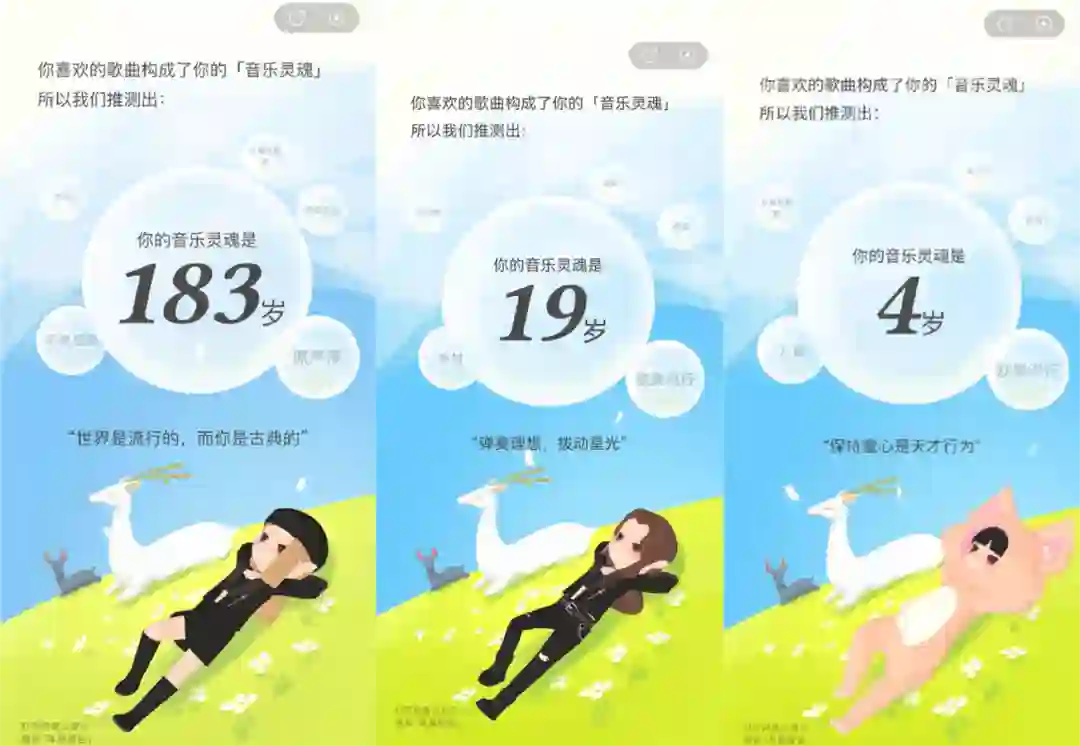 俞诗则是被这波分享中的“音乐灵魂”这一词吸引的,她很好奇,“为什么是XX岁,是怎么统计出来的,我的音乐灵魂是多少岁?”当得知自己的音乐灵魂只有8岁时,她在朋友圈跟风了这波讨论,调侃地写道“谢谢,应该是四岁才对”。