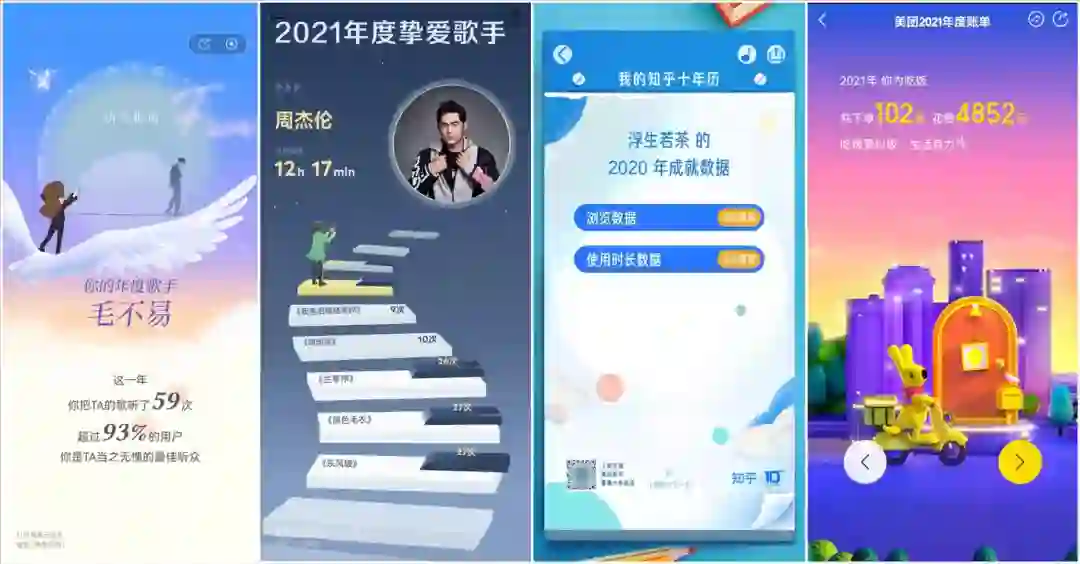 在去年,豆瓣、知乎、支付宝、淘宝、QQ音乐、微信读书、滴滴、百度、美团、高德、B站、今日头条、微博等,至少有30+家的APP推出过年度报告。
