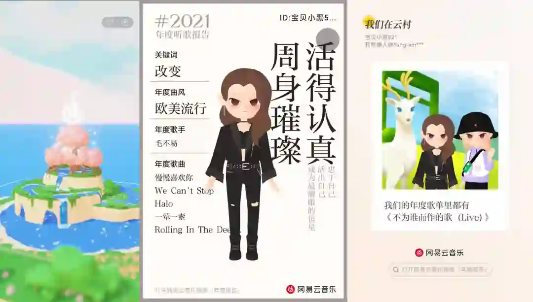 出发去往2021前,用户需要选择定制化的虚拟人物形象,架上“云”飞往村落,随即就展开了在网易云的故事。