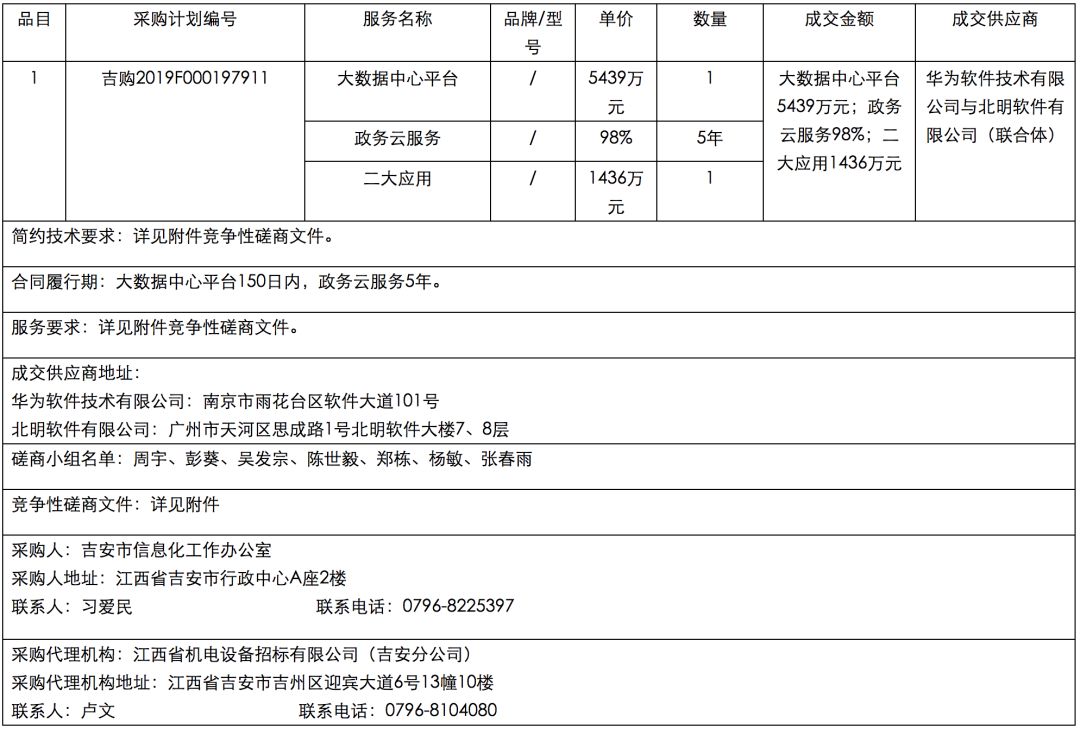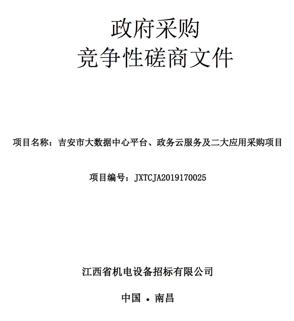 江西省机电设备招标有限公司受吉安市信息化工作办公室委托,根据吉购2019F000197911号采购计划确定的竞争性磋商采购方式,就吉安市大数据中心平台、政务云服务及二大应用采购项目(项目编号:JXTCJA2019170025)进行了竞争性磋商。项目预算 14421.9 万元。