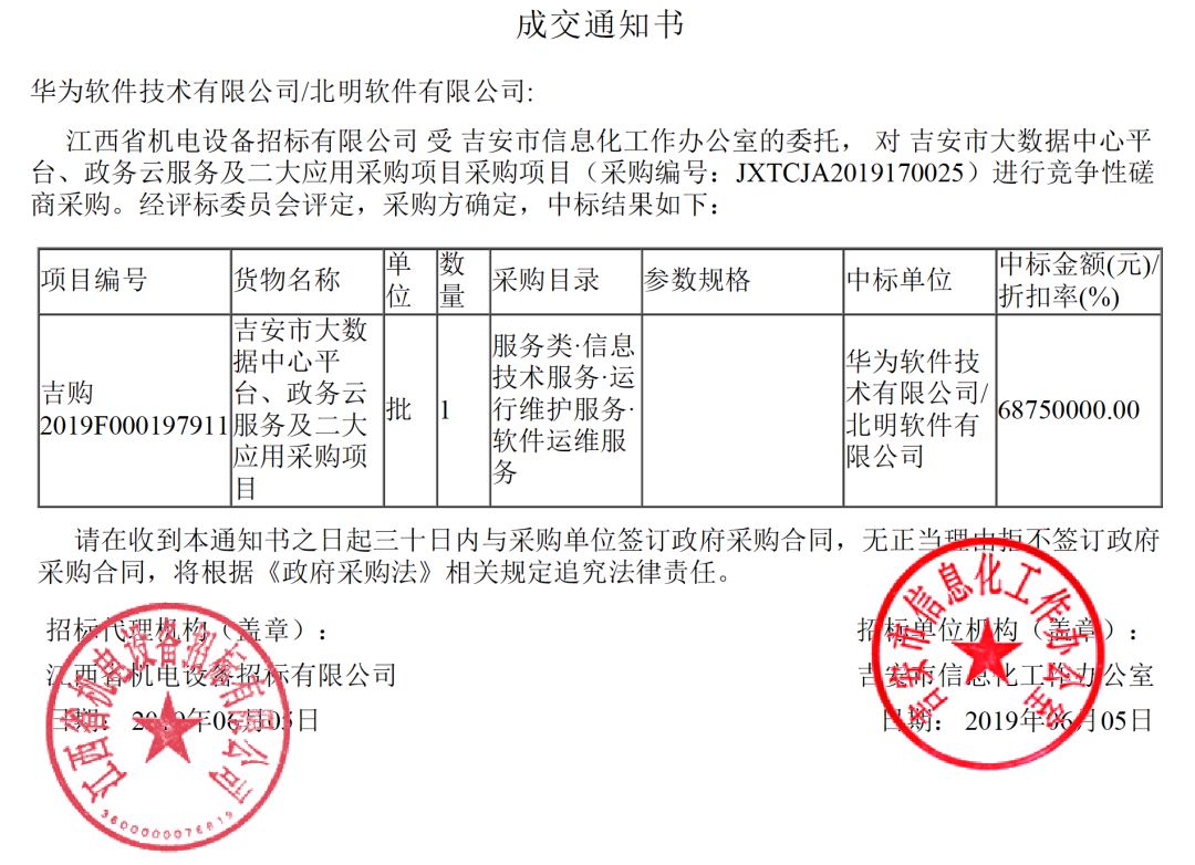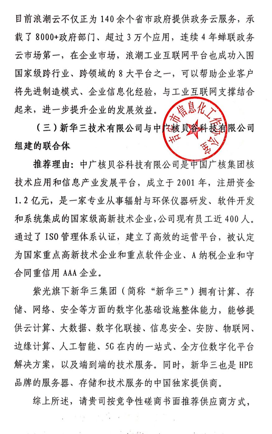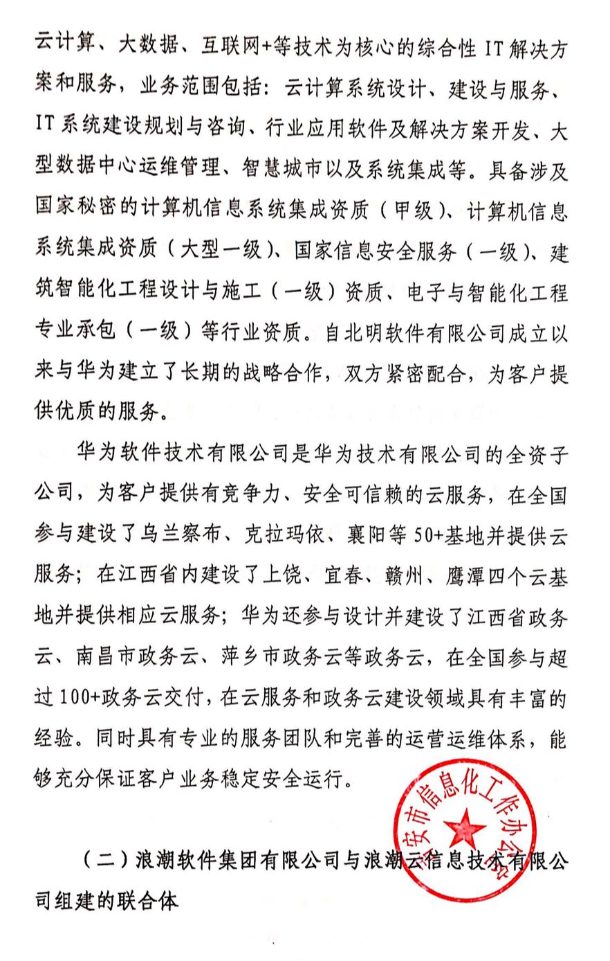 吉安市信息化工作办公室推荐三家供应商,分别是北明软件与华为联合体、浪潮软件与浪潮云联合体、新华三与中广核贝谷科技联合体: