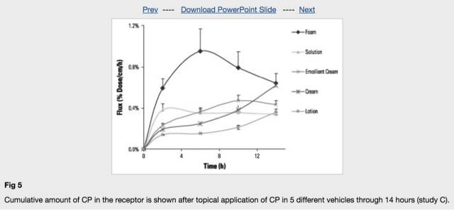 从以上的图表可以看出,泡沫(黑色方块那条线)刚开始的渗透通量是最高的——这意味着对比起其它质地,泡沫质地能使皮肤随时随地含有比较高浓度的有效成分,特别是在使用产品的初期。