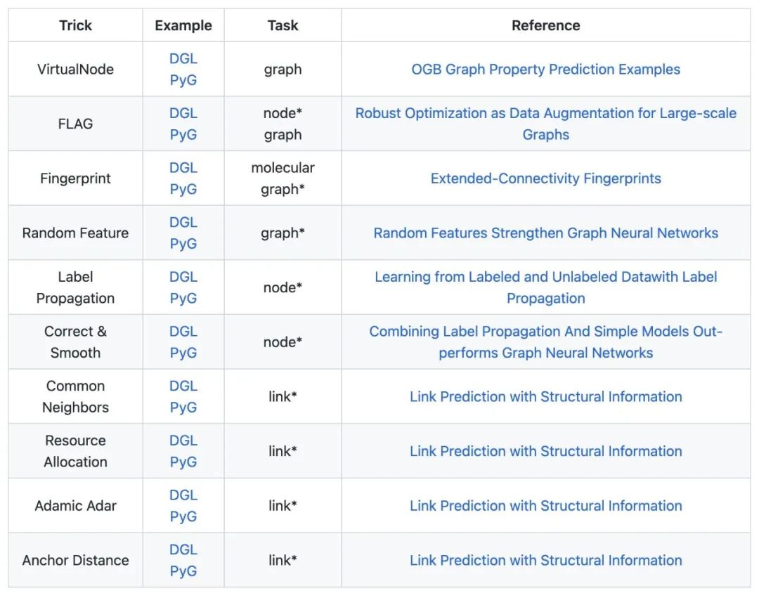 3. 同时支持 DGL 与 PyG。我们对每个 trick 同时提供 DGL 与 PyG 两种实现以及相应的示例。无论您喜欢哪款图深度学习库,都可以尝试使用它。
