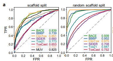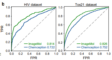作者首先使用 8 种药物发现的基准数据集来评估 ImageMol 的性能,并且使用两种最流行的拆分策略(scaffold split 与 random scaffold split)来评估 ImageMol 在所有基准数据集上的性能。在分类任务中,利用受试者工作特性(Receiver Operating Characteristic, ROC)曲线以及曲线下的面积(Area Under Curve, AUC)来评估,从实验结果可以看出,ImageMol 均能得到较高的 AUC 值 (图 a) 。