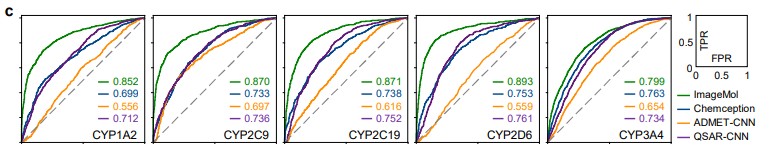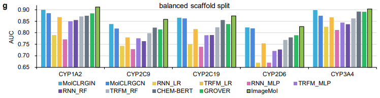 ImageMol 与基于序列的模型(包括 RNN_LR、TRFM_LR、RNN_MLP、TRFM_MLP、RNN_RF、TRFM_RF 和 CHEM-BERT)和基于图的模型(包括 MolCLRGIN、MolCLRGCN 和 GROVER)相比,如图 g 所示,ImageMol 在 CYP1A2、CYP2C9、CYP2C19、CYP2D6、CYP3A4 上实现了更好的 AUC 性能。
