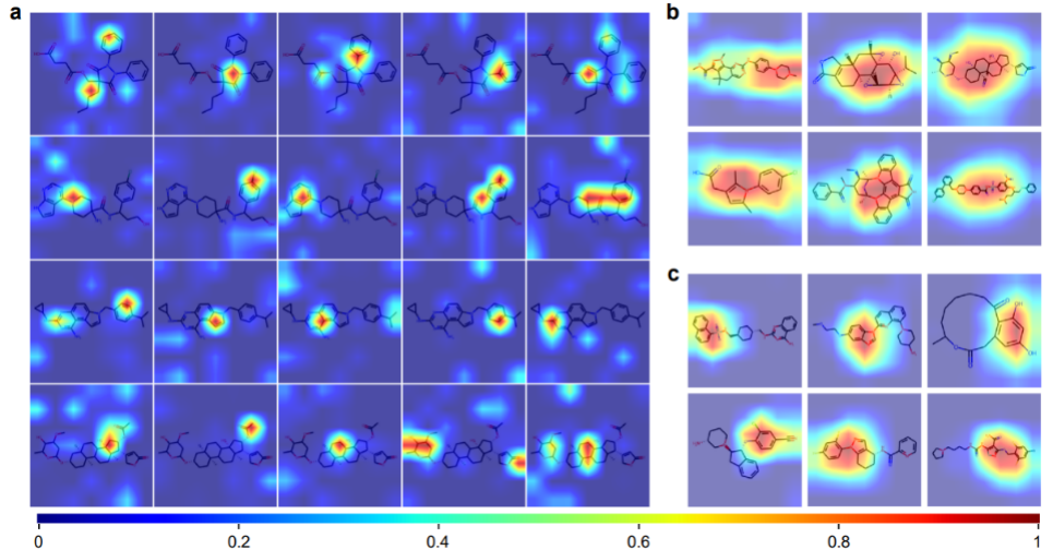 ImageMol 可以从分子图像表示中获取化学信息的先验知识,包括 = O 键、-OH 键、-NH3 键和苯环。图 b 和 c 为 ImageMol 的 Grad-CAM 可视化的 12 个示例分子。这表示 ImageMol 同时准确地对全局 (b) 和局部 (c) 结构信息进行注意捕获,这些结果使研究人员能够在视觉上直观地理解分子结构是如何影响性质和靶点。