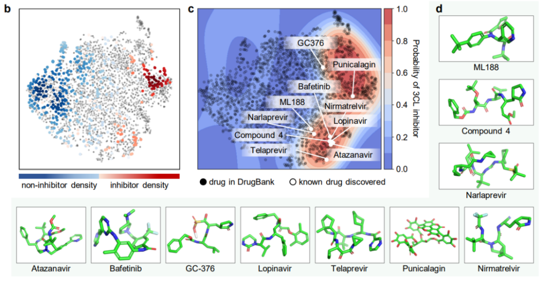 另外,ImageMol 鉴定出 16 种已知 3CL 蛋白酶抑制剂中的 10 种,并将这 10 种药物可视化到图中的包埋空间(成功率 62.5%),表明在抗 SARS-CoV-2 药物发现中具有较高的泛化能力。使用 HEY293 测定来预测抗 SARS-CoV-2 可再利用药物时,ImageMol 成功预测了 70 种药物中的 42 种(成功率为 60%),这表明 ImageMol 在推断 HEY293 测定中的潜在候选药物方面也具有很高的推广性。下图 c 展示了 ImageMol 在 DrugBank 数据集上发现 3CL 潜在抑制剂的药物。图 d 展示了 ImageMol 发现的 3CL 抑制剂的分子结构。