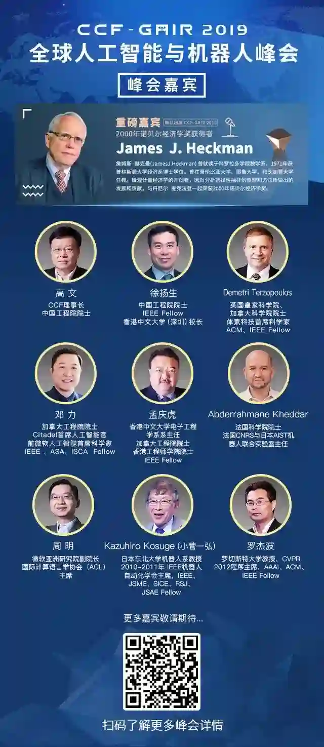 由中国计算机学会主办、雷锋网和香港中文大学(深圳)联合承办的 2019 全球人工智能与机器人峰会,将于 2019 年 7 月 12 日至 14 日在深圳举行。届时,诺贝尔奖得主JamesJ. Heckman、中外院士、世界顶会主席、知名Fellow,多位重磅嘉宾将亲自坐阵,一起探讨人工智能和机器人领域学、产、投等复杂的生存态势。