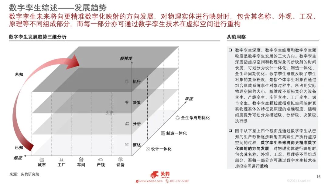 数字孪生应用以分立的单场景及精细化为主:在增加数字孪生深度、拓展数字孪生维度和精细化数字孪生颗粒度三个方向中,精细化数字孪生颗粒度累计占比高达87%,远超过其他两个方向。综合分析各方向占比,2021年数字孪生落地应用情况以分立的单场景应用及精细化为主,而对于全生命周期优化及复杂场景的赋能不足,发展水平及成熟度处于较初级的阶段。