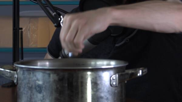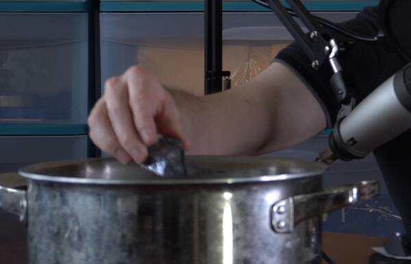 第七步,取一点单晶硅,将其浸入熔化硅(molten silcon)的缸中。