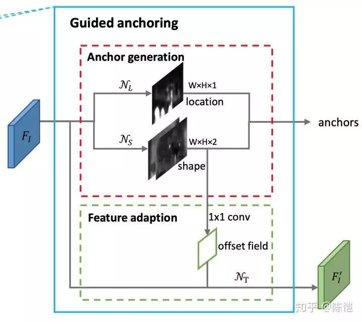 如图所示,在原始 RPN 的特征图基础上,我们采用两个分支分别预测 anchor 位置和形状,然后结合在一起得到 anchor。之后采用一个 Feature Adaption 模块进行 anchor 特征的调整,得到新的特征图供之后的预测(anchor 的分类和回归)使用。整个方法可以 end-to-end training,而且相比之前只是增加了 3 个 1x1 conv 和一个 3x3 deformable conv,带来的模型参数量的变化很小。