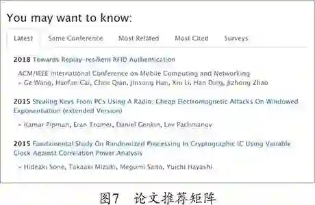 AceMap从五个维度对每篇论文进行了相似论文推荐,形成论文推荐矩阵。这些维度包括最新、同会议、最相关、被引用数最多和导读类论文。例如,针对美国伊利诺伊大学香槟分校的Anadi Chaman等撰写的论文“Ghostbuster: Detecting the Presence of Hidden Eavesdroppers”,AceMap实现的论文推荐矩阵如图7所示。这种多维度推荐方式能够满足不同用户的不同需求