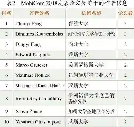 “Author Statistics”统计了几个时间段各作者在MobiCom会议上发表论文数量。表2展示了2018年排名前十的作者及论文发表数量。