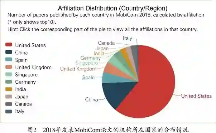 “Affiliation Distribution”统计了2018年发表MobiCom论文的机构所在国家的分布情况,前十位的国家如图2所示。