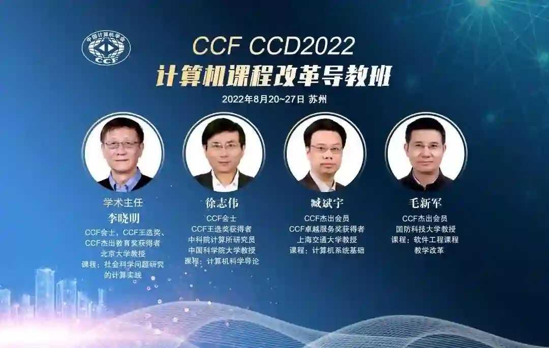 CCF计算机课程改革导教班CCD2022将于8月20~27日在苏州举办。我们邀请到北大李晓明、国科大徐志伟、上交大臧斌宇、国防科大毛新军等专家讲授四门课程:社会科学问题研究的计算实践、计算机科学导论、计算机系统基础、软件工程课程教学改革。