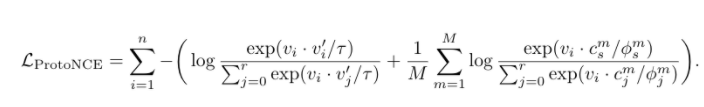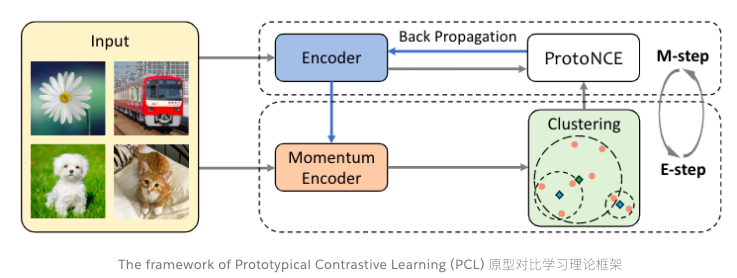 我们引入原型 c 作为与观测数据相关的潜在变量,提出了一种期望最大化算法来求解最大似然估计。在 E-step 中,我们通过执行 K 平均算法估计原型的概率。在 m 步中,我们通过训练模型来最大化似然估计,从而最小化一个 ProtoNCE 损失: