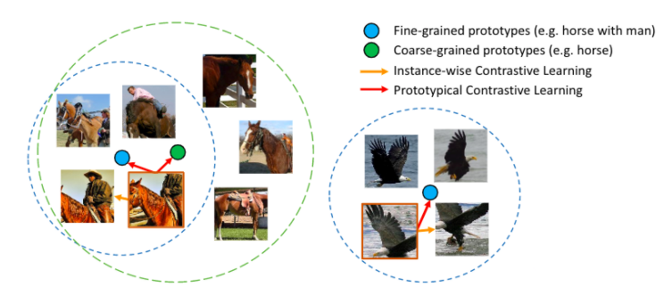 在 PCL 中,我们引入了一个「原型」作为由相似图像形成的簇的质心。我们将每个图像分配给不同粒度的多个原型。训练的目标是使每个图像嵌入更接近其相关原型,这是通过最小化一个 ProtoNCE 损失函数来实现的。