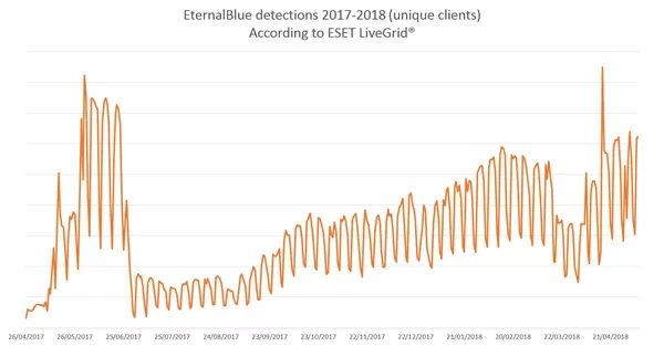 安全机构ESET监测发现,勒索病毒爆发后,随着各方采取应对措施,永恒之蓝的利用率急速下降,一度每天“只有”几百例攻击,但是从2017年9月开始,攻击事件不断增加,到2018年4月份达到了一个新的高峰,甚至超过了勒索病毒爆发最严重的时候,创下了新纪录。