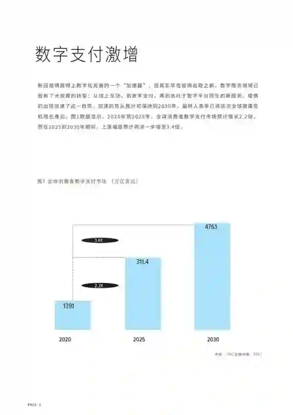 新冠疫情算得上数字化发展的一个“加速器”,但其实早在疫情出现之前,数字服务领域已经有了大规模的转型:从线上互动,到数字支付,再到依托于数字平台而生的新服务。疫情的出现加速了这一趋势,加速的势头预计将保持到2030年。图1数据显示,2020年到2025年,全球消费者数字支付市场预计增长2.2倍,而在2025到2030年期间,上涨幅度预计将进一步增至3.4倍。